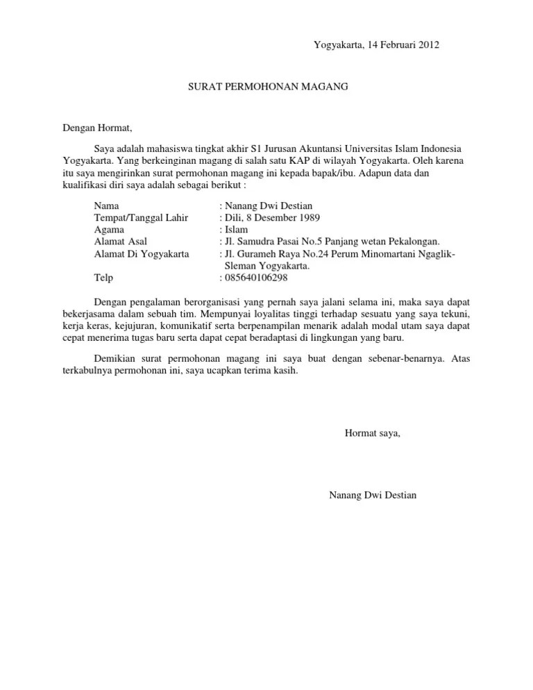 Contoh surat permohonan magang kerja yang baik dan benar. Pengertian surat lamaran kerja magang pkl program bina magang. Berikut contoh surat lamaran kerja yang dapat dijadikan referensi untuk melamar pekerjaan di . Contoh surat lamaran magang kerja perusahaan. Berdasarkan informasi yang saya peroleh dari situs resmi origon hotel, .